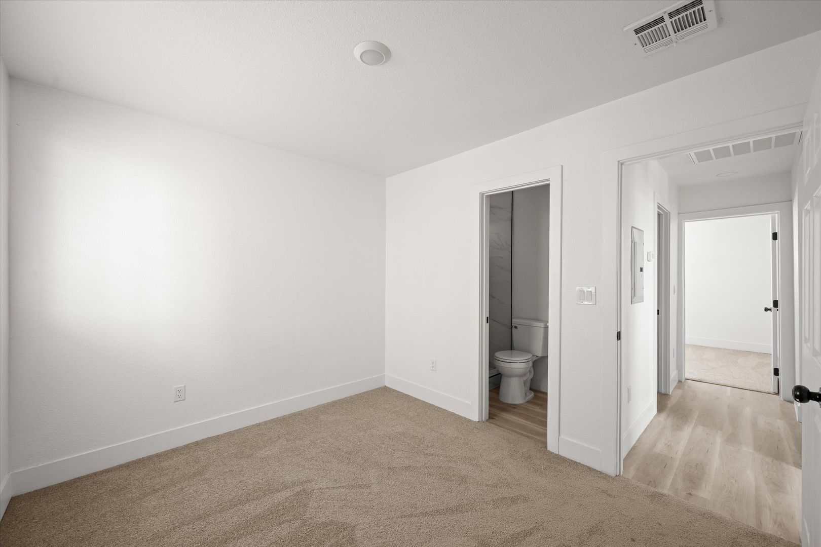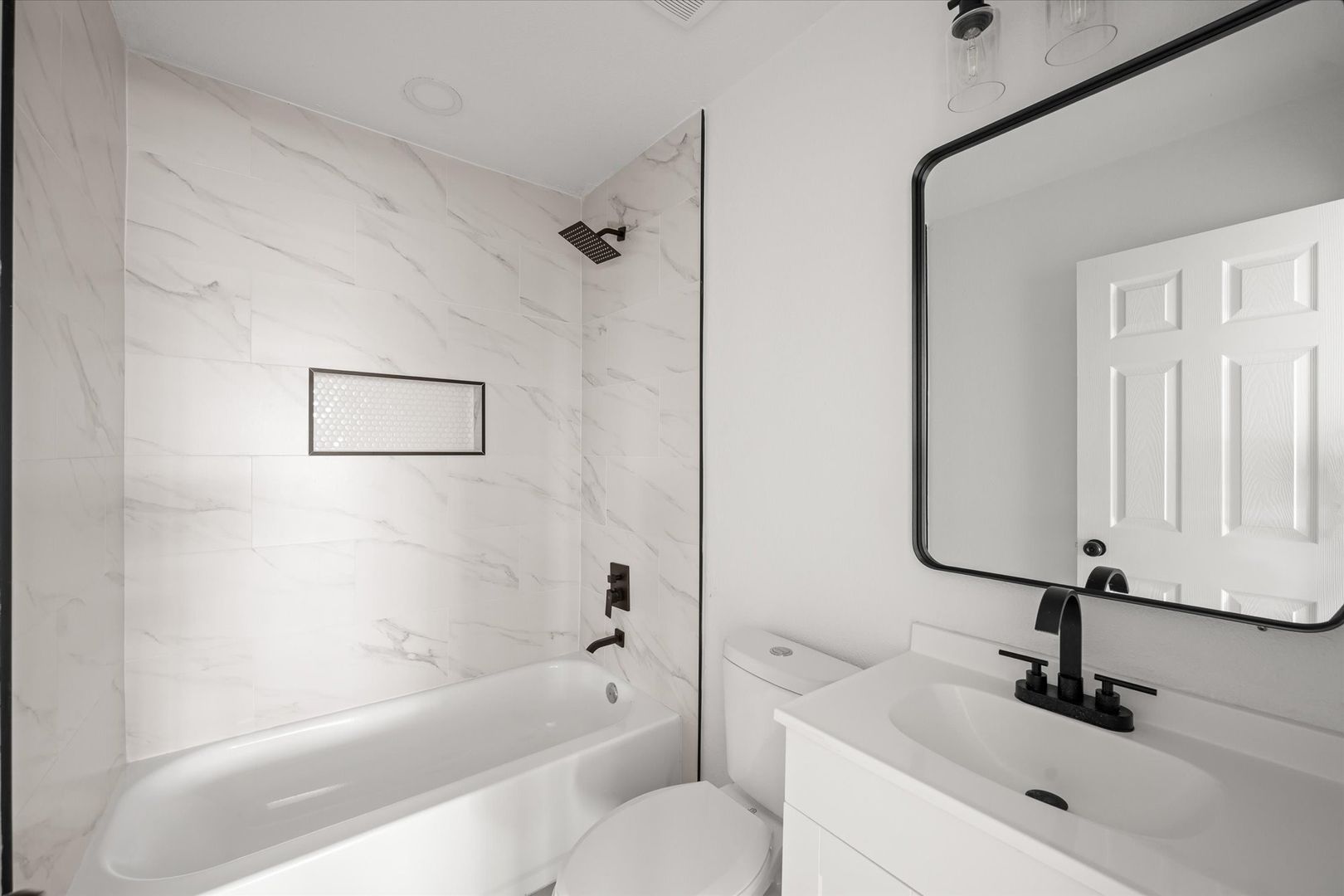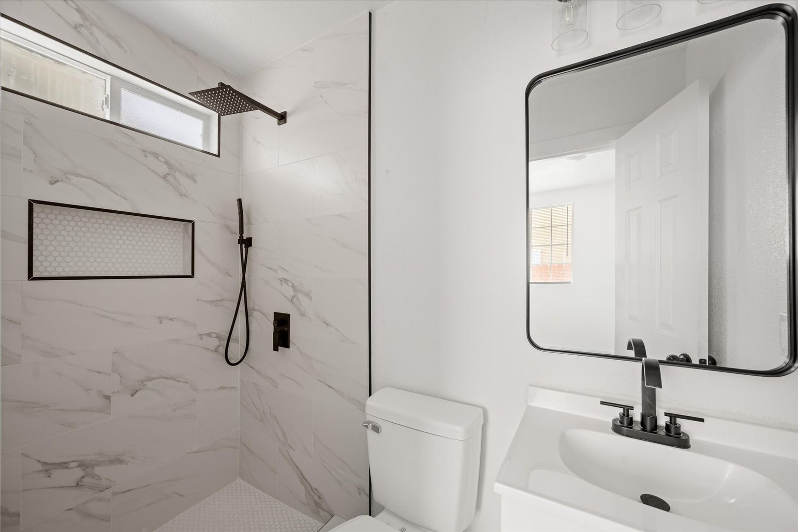 The bathroom has been thoughtfully updated with a sleek vanity and tiled shower, giving it a clean, modern finish.