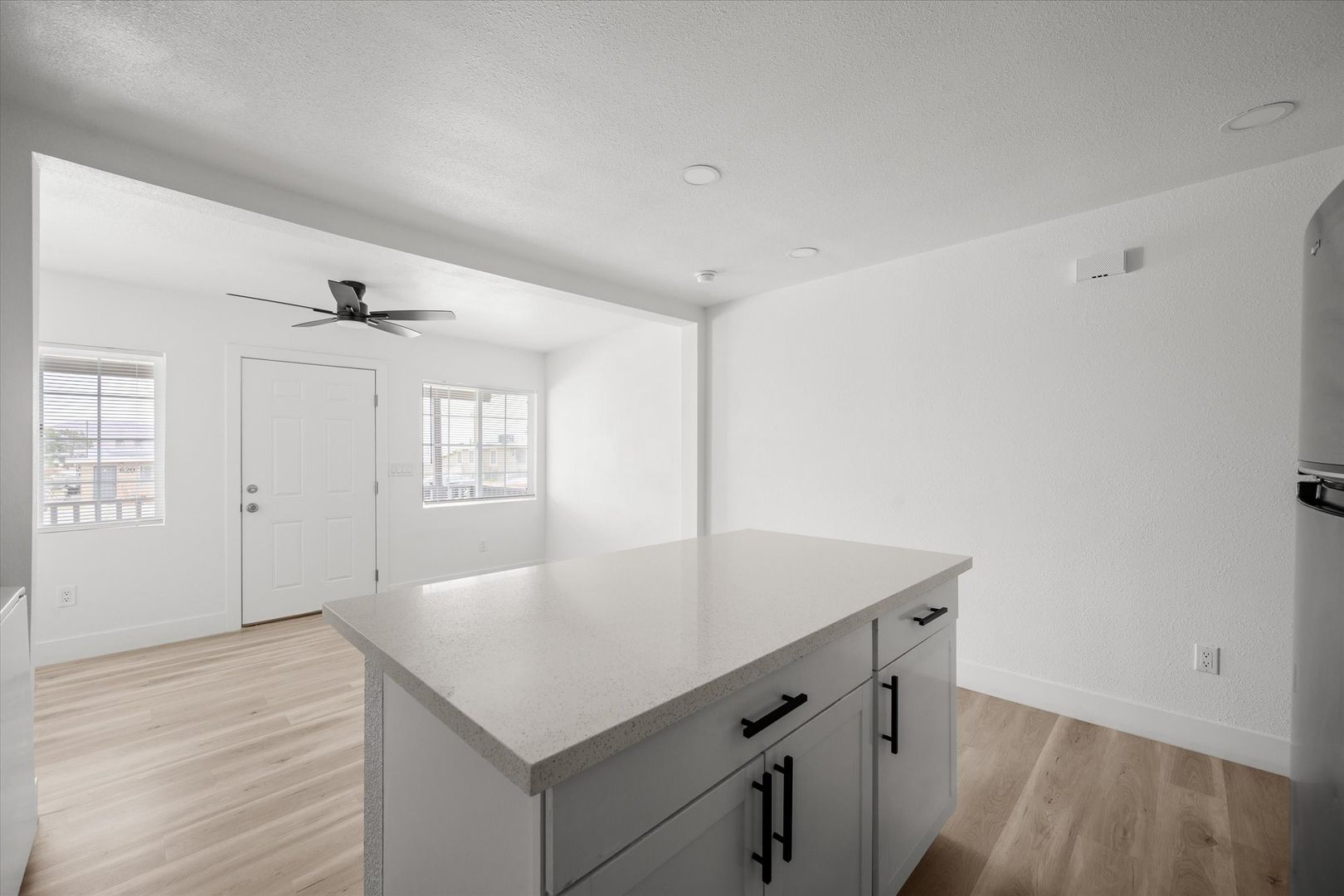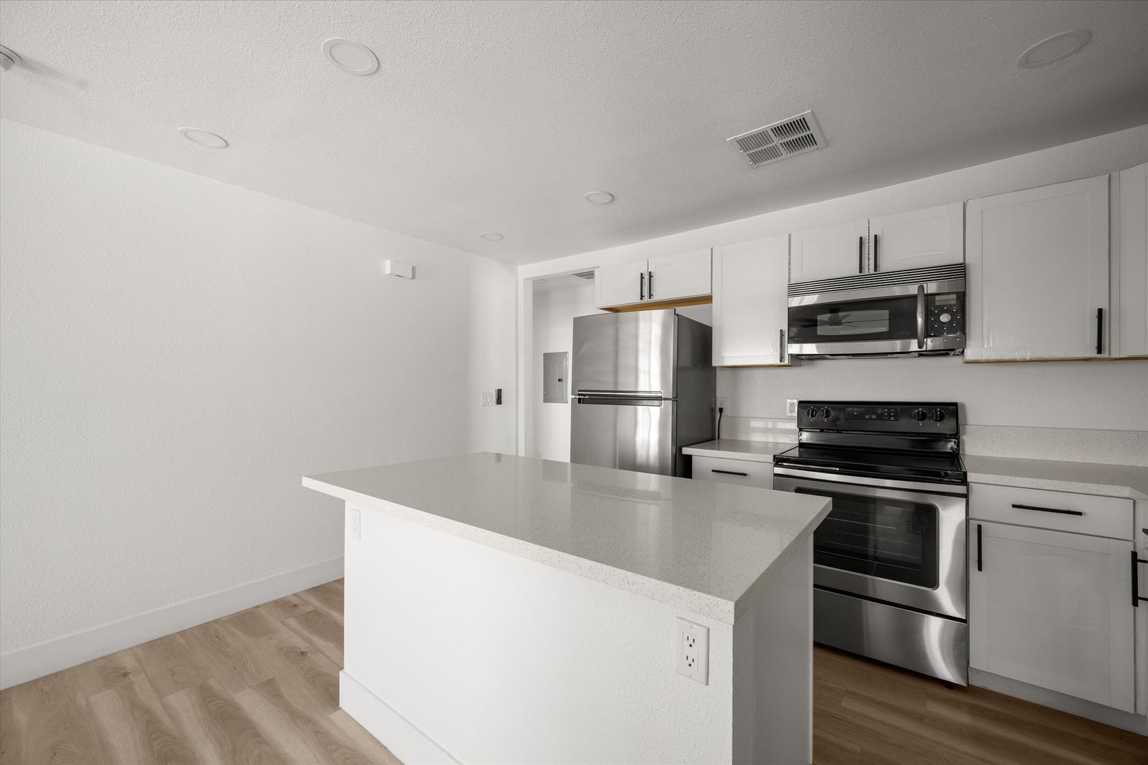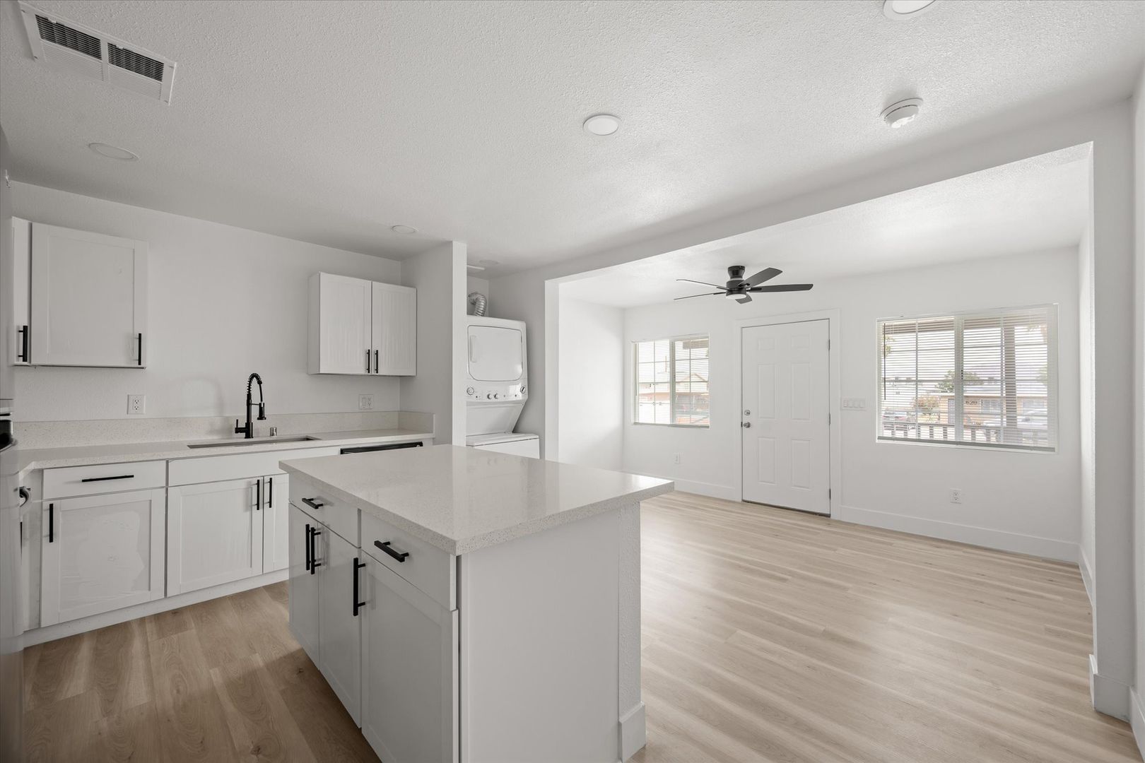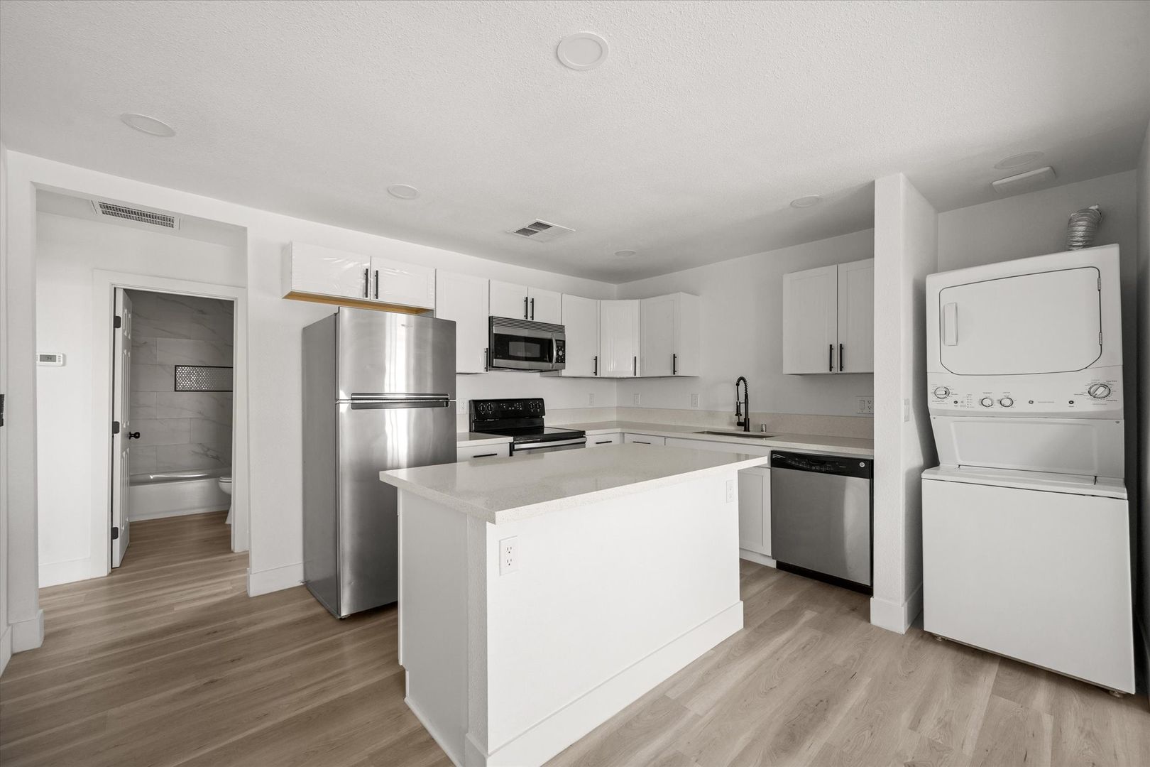 Step inside to an open-concept layout featuring stylish laminate flooring, recessed lighting, and a bright, contemporary feel throughout. The upgraded kitchen is designed to impress with white shaker cabinets, quartz countertops, and stainless steel appliances—including a refrigerator, range, microwave, and in-unit stacked washer & dryer for added convenience.