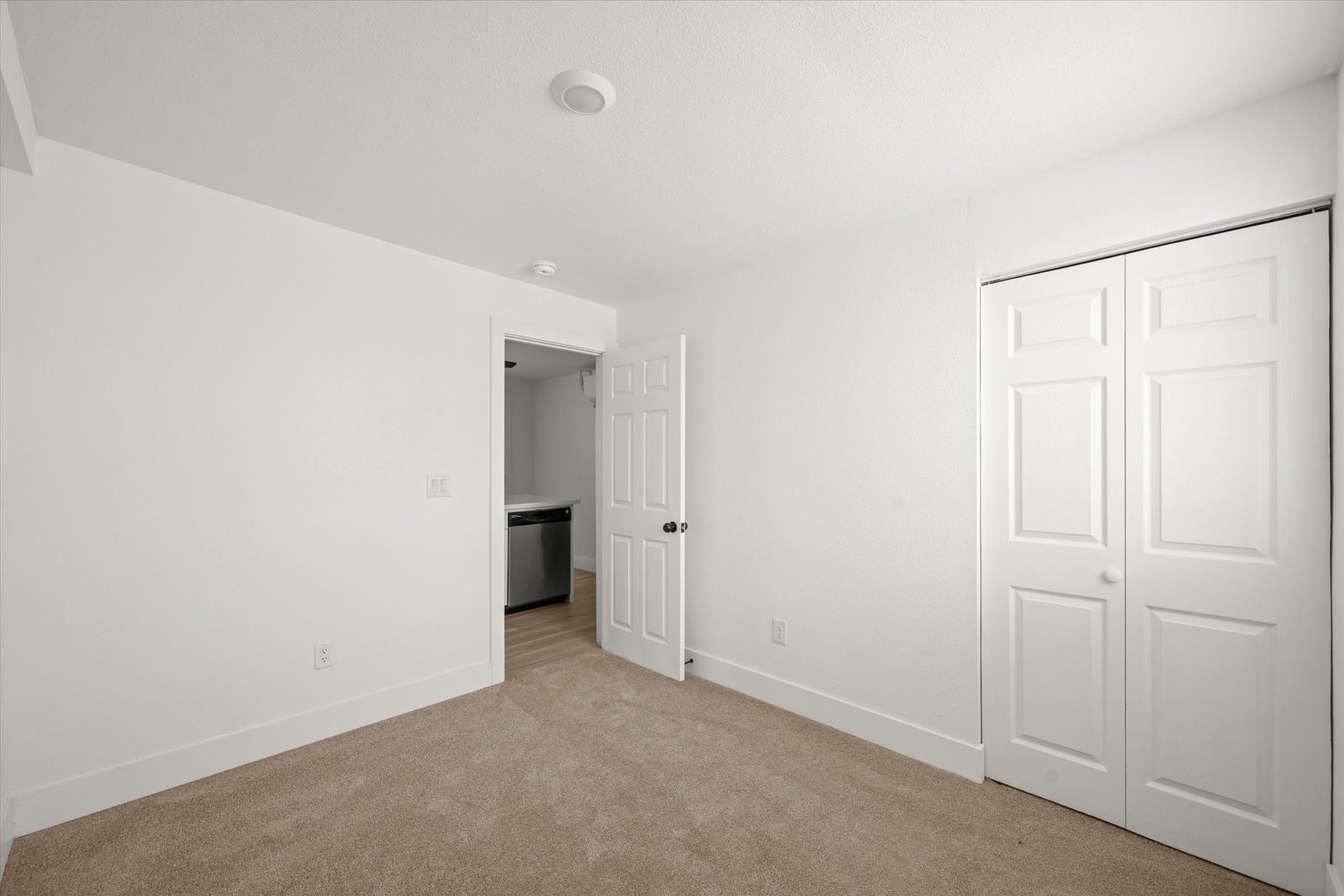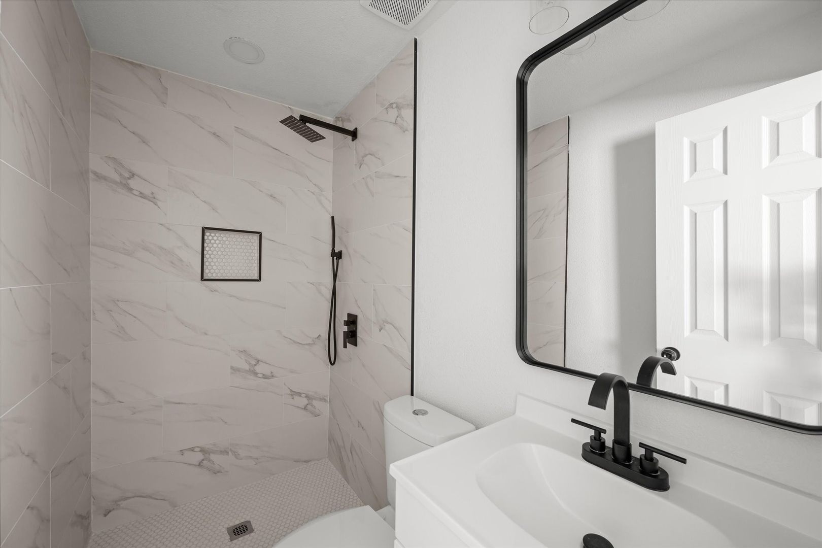 The bathroom has been thoughtfully updated with a sleek vanity and tiled shower, giving it a clean, modern finish.