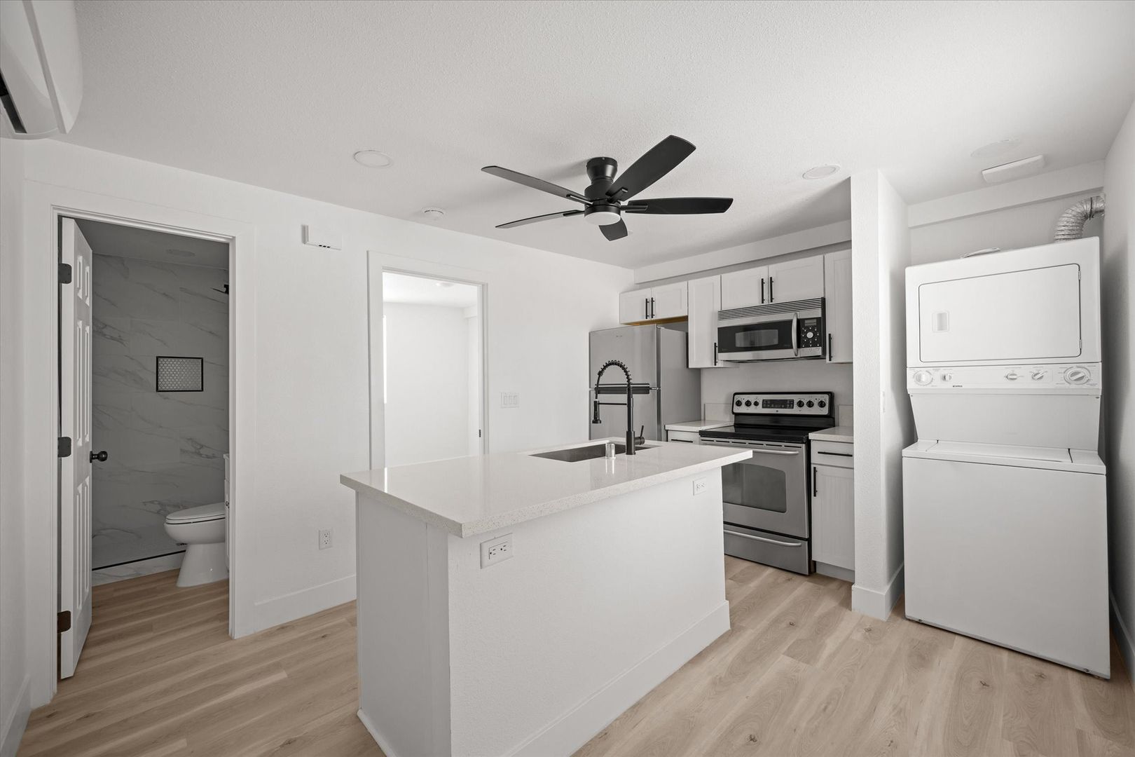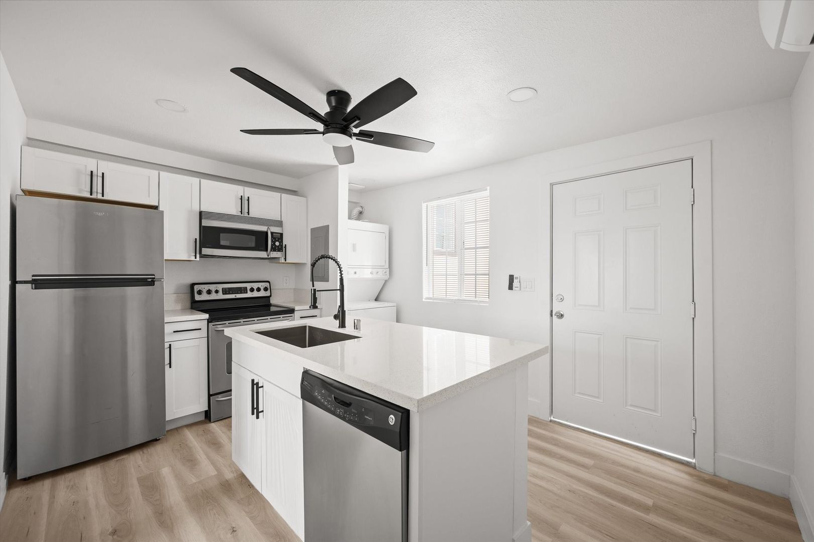 Step inside to an open-concept layout featuring stylish laminate flooring, recessed lighting, and a bright, contemporary feel throughout. The upgraded kitchen is designed to impress with white shaker cabinets, quartz countertops, and stainless steel appliances—including a refrigerator, range, microwave, and in-unit stacked washer & dryer for added convenience.