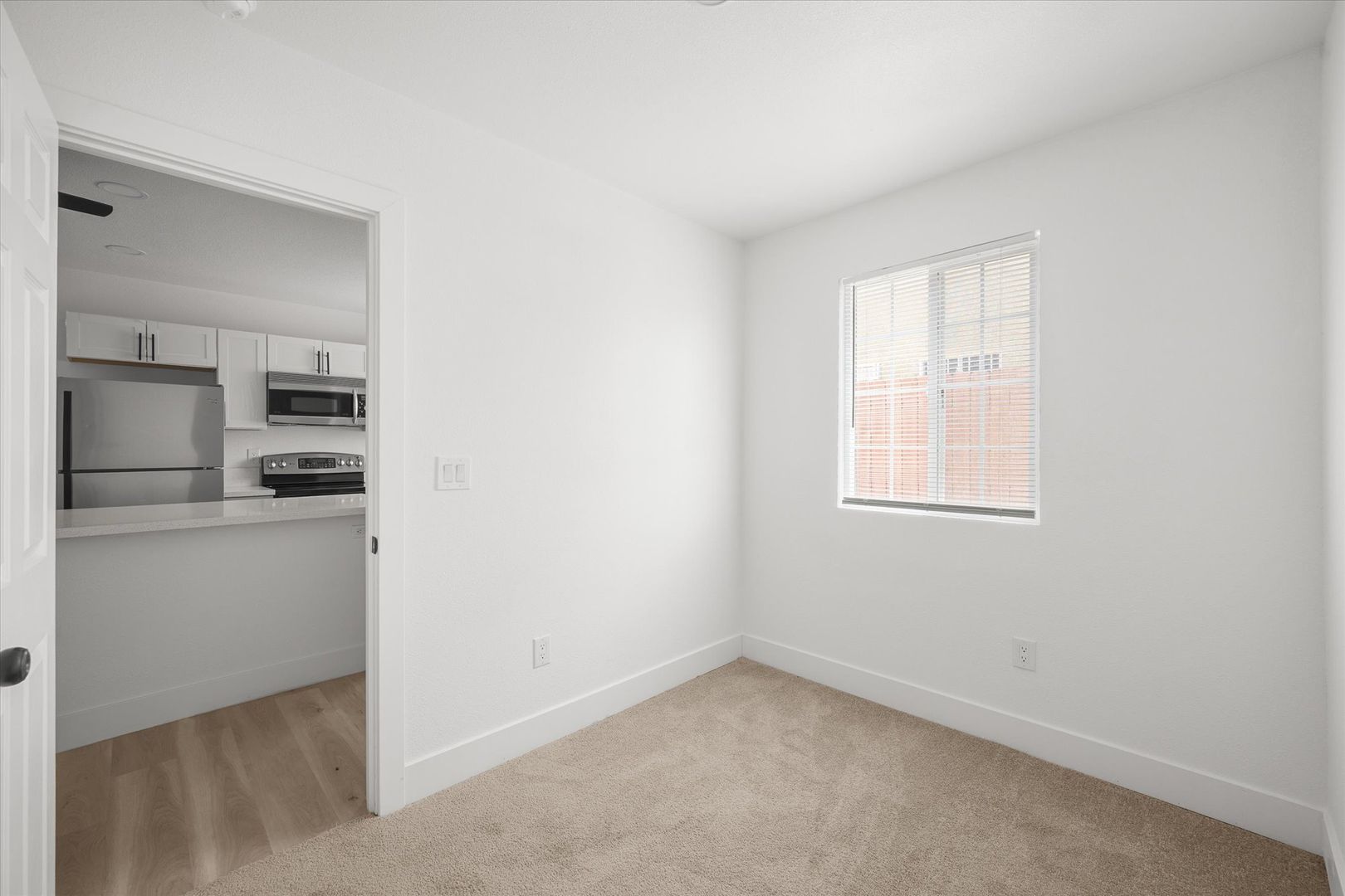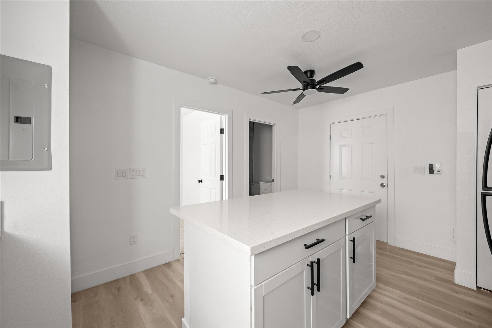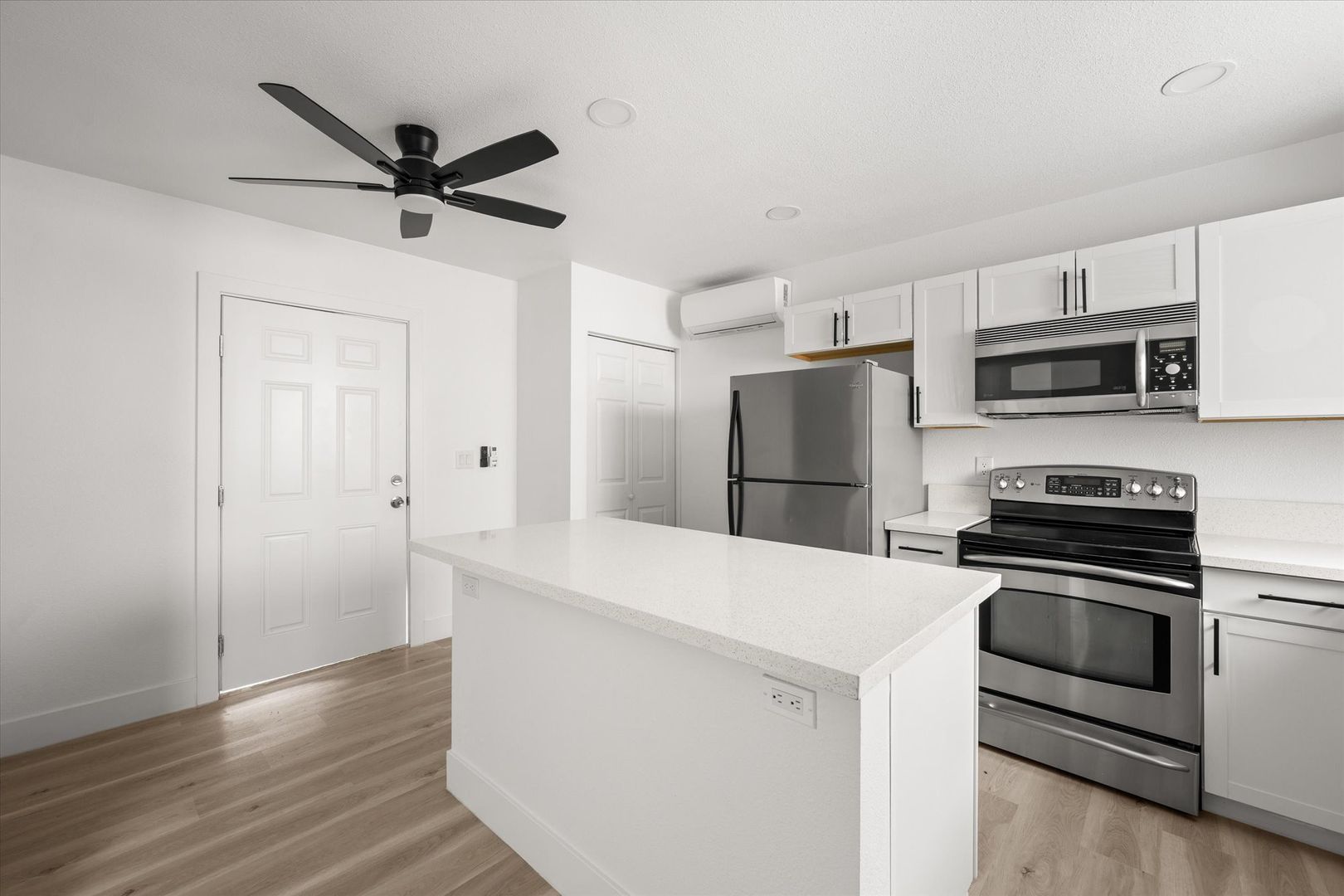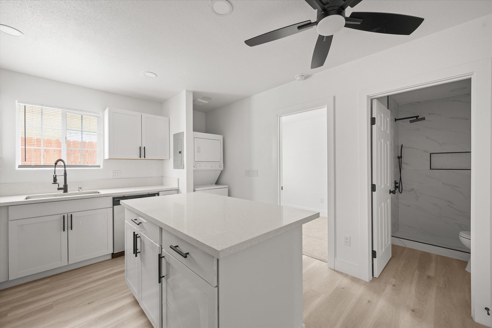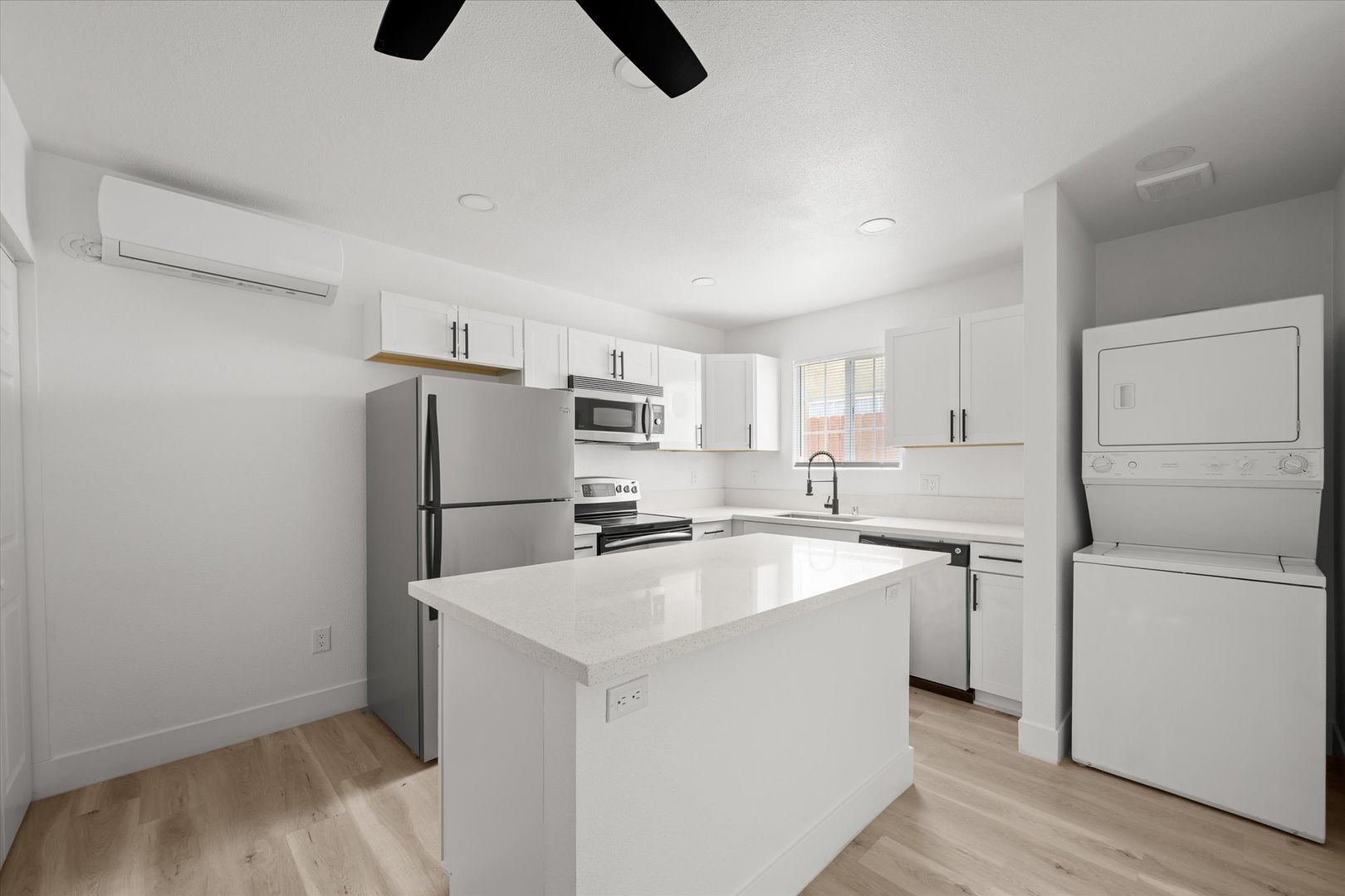 Step inside to an open-concept layout featuring stylish laminate flooring, recessed lighting, and a bright, contemporary feel throughout. The upgraded kitchen is designed to impress with white shaker cabinets, quartz countertops, and stainless steel appliances—including a refrigerator, range, microwave, and in-unit stacked washer & dryer for added convenience.