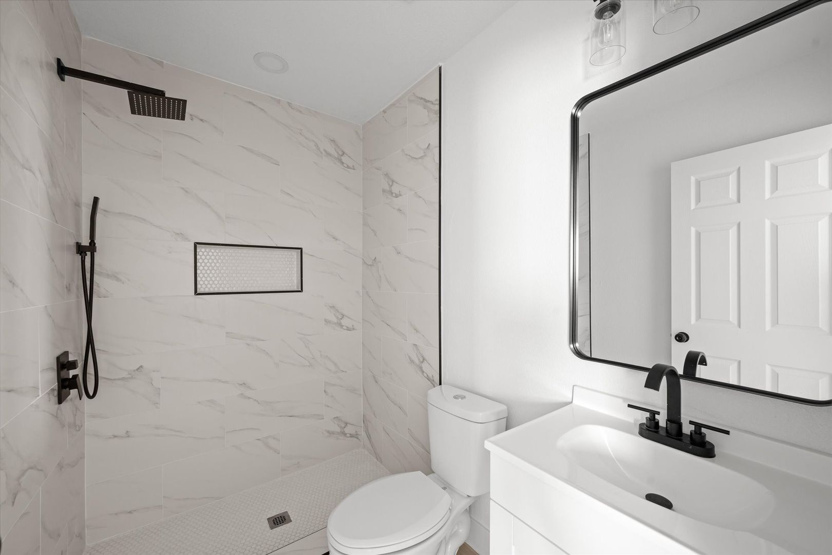 The bathroom has been thoughtfully updated with a sleek vanity and tiled shower, giving it a clean, modern finish.
